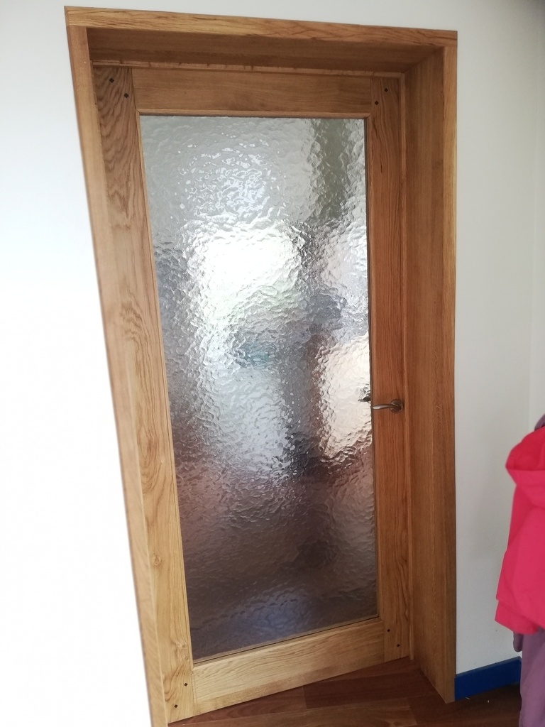 Et le verre doit être calé en diagonale (je ferai un croquis dans la journée), sinon, son poids fait s'affaisser ta porte. Sinon, beau choix de bois et de finition, ça rend bien !