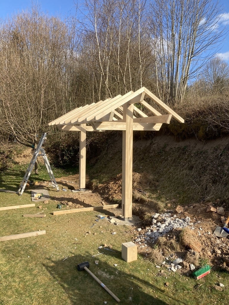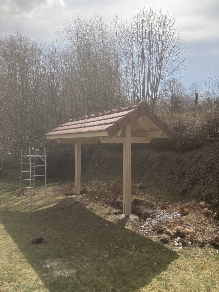 Je volige un côté, je contre latte, puis je latte, et je tuile. Je préfère ne pas avoir à monter sur les rampants, donc l’ouverture en face me permet d’atteindre le pan à tuiler. Ça désaxe juste un peu la structure à cause du poids de l’ensemble. Je ne perds pas de temps, et je réalise la même operation sur l’autre pan. Pour ce pan la, j’ai l’accès à l’avant à l’aide d’un échafaudage. Ce qui n’était pas possible de l’autre côté à cause du talus. Je remet tout d’aplomb, et je visse à mort mes pieds sur mes poteaux, et ça ne bouge plus.