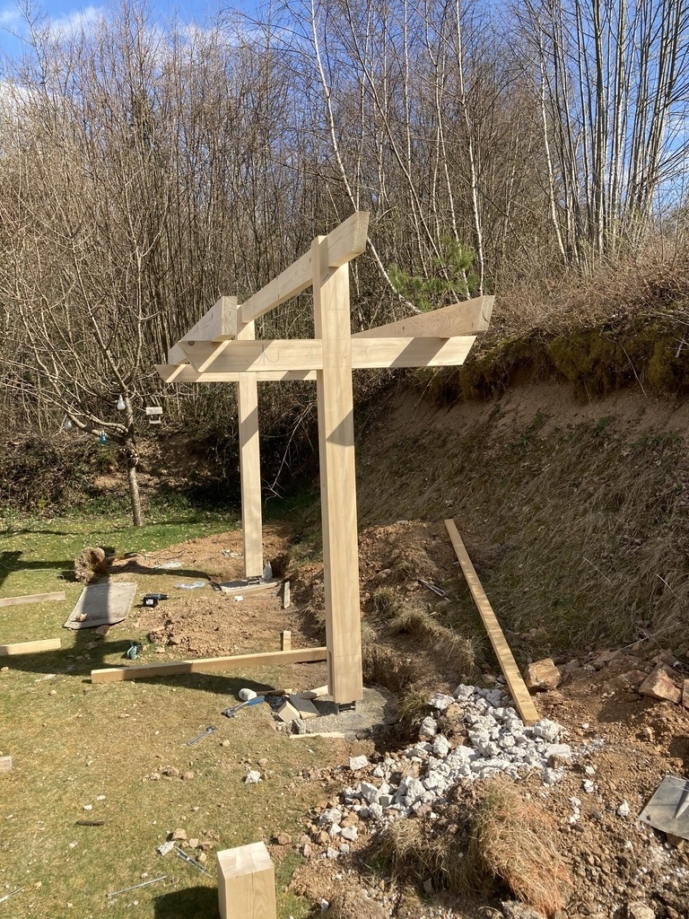 Les poteaux ont une section de 150x150. À refaire, je pense que je ferai sur quatre poteaux, ou je prévoirai des jambes de force sous les pièces horizontales.