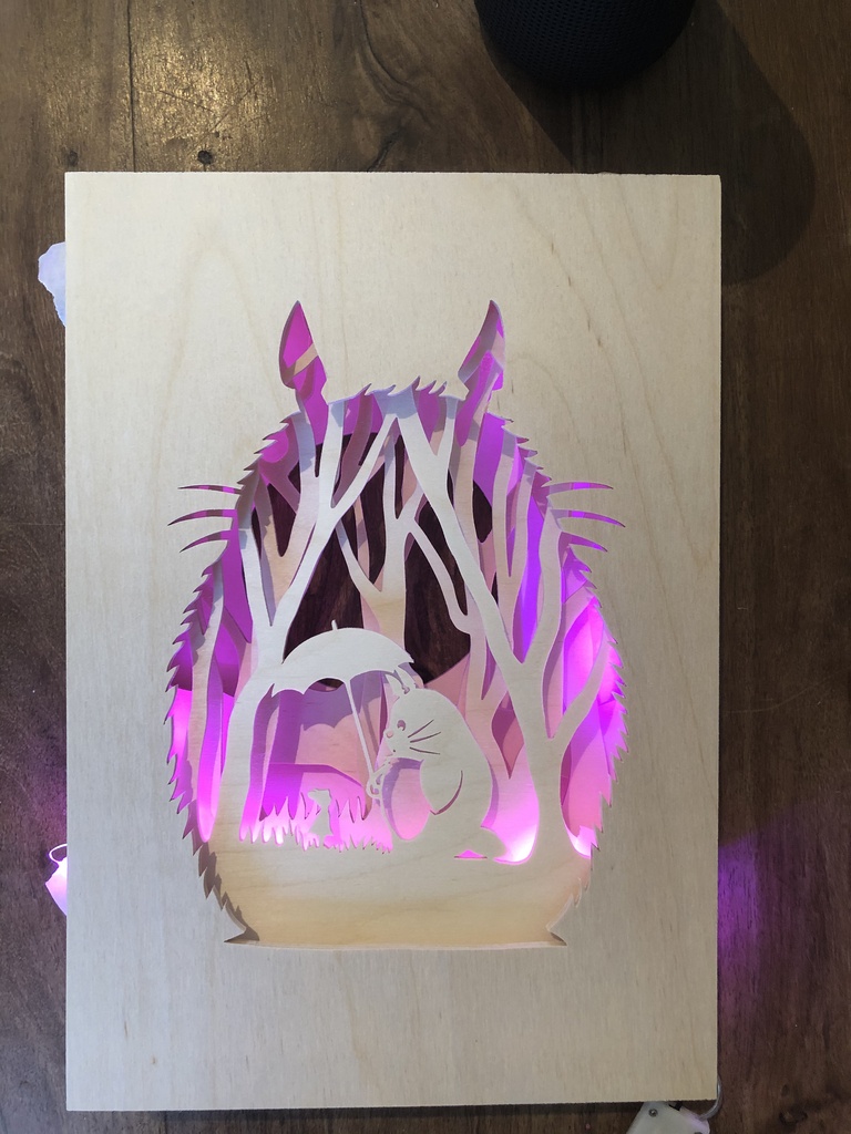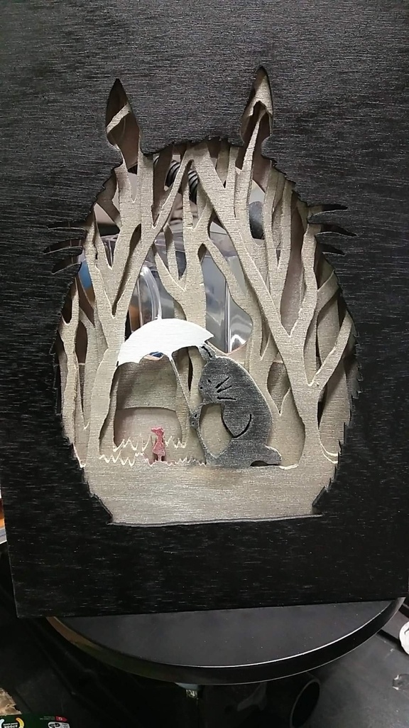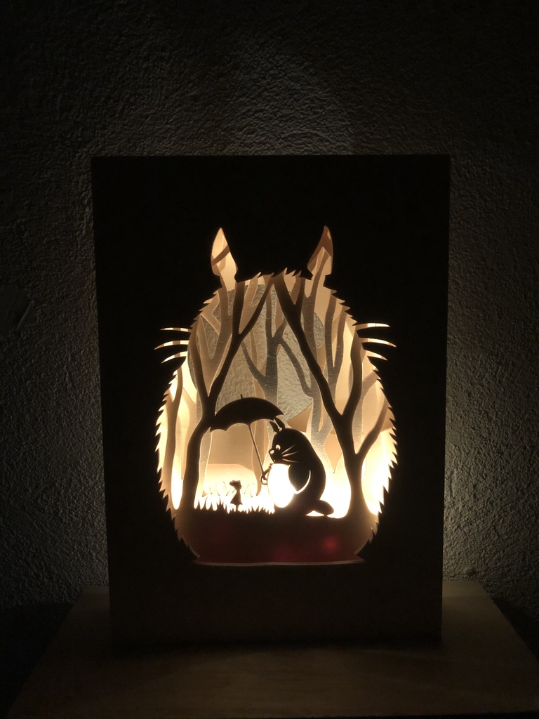 ma fille étant une fan inconditionnelle de Totoro et de tout ce qui touche l'univers de Miyasaki en voyant vos oeuvres je me lance.J'ai en vous remerciant du partage commencé la découpe des panneaux.Mais une petite question ... Comment avez vous positionné vos lumières à l'intérieur.Vous remerciant de votre réponse.Cdlt