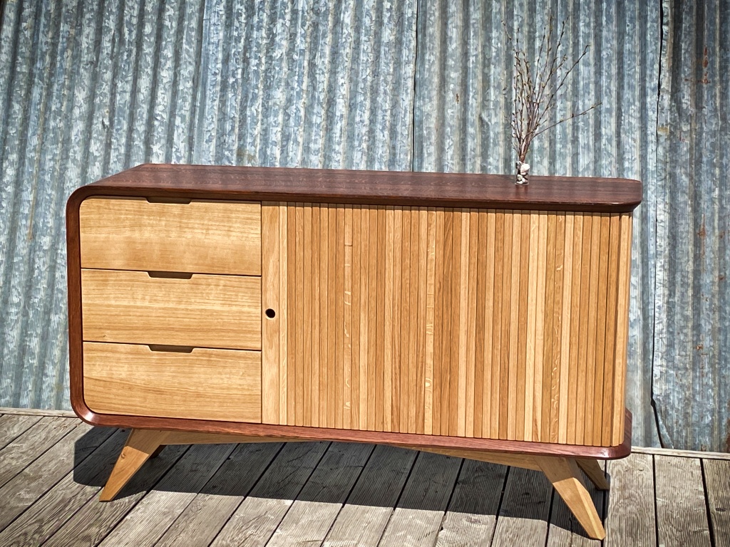 c'est tellement tout parfait ! le design élégant, avec le contraste des couleurs, les petits biseaux sur les chants, les pieds gainés inclinés, le tout massif, le défi des angles arrondis (chapeau la technique tout-scie-circulaire ! ), la finition dans le détail, et bien sur le rideau. Proportions impeccables, poignées nickel. Si je voulais chipoter (et je pense que c'est un meuble qui mérite qu'on le chipote un peu, il va chercher loin dans la qualité, il peut aller encore un pas de plus) je dirais que les tiroirs en mdf sur coulisses blum c'est dommage, ça mériterait un tiroir bois à queues d'arronde et fond massif, sur coulisse bois. J'ai découvert récemment que des coulisses bois bien ajustées et paraffinées, ça glisse tellement bien. et avec un bon ajustage des façades et la compression d'air dans un volume fermé, on arrive même à un effet amorti type blumotion. Mais pouah, super réalisation je suis méga-fan, j'ai l'impression de voir le meuble que je rêve de faire.