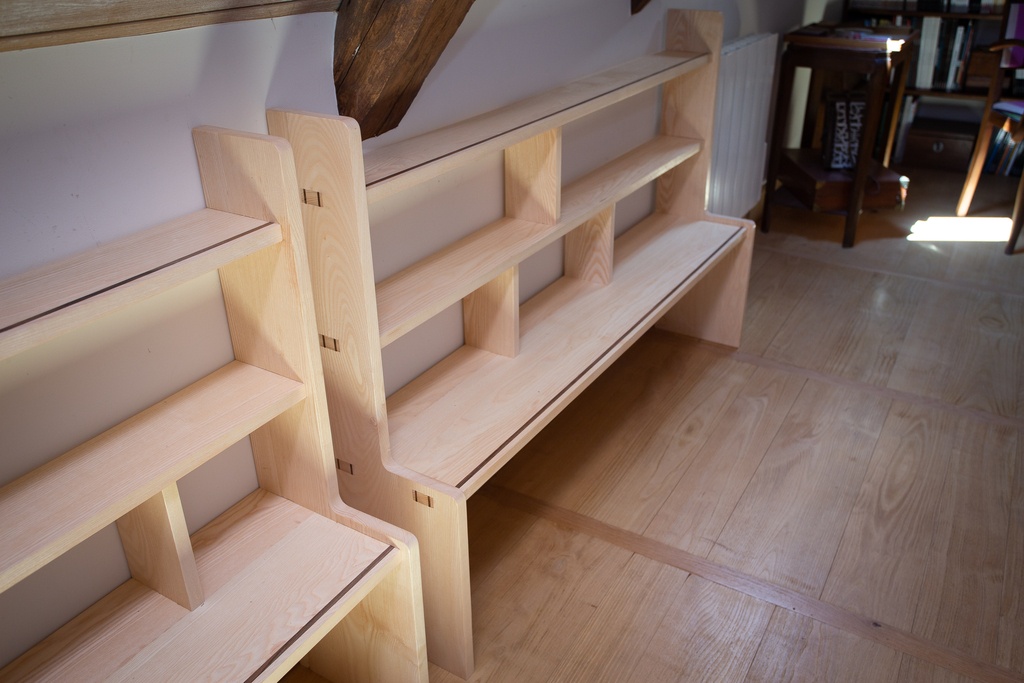 Deux étagères / bibliothèques basses pour livres de poche et BD, faites pour aller contre un mur sous pente.