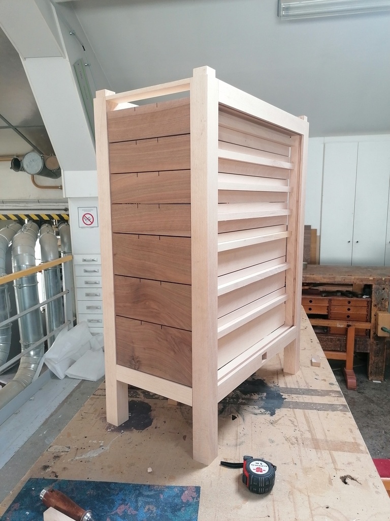Pas mal de temps d'assemblage car il y a quand même 12 tiroirs plus 2 tablettes (assemblé en rainure languette). Les tiroirs sont en coulisse traditionnelle dans le caisson et une fois les coulisseaux paraffiné c'est pas du Blum mais pas loin!