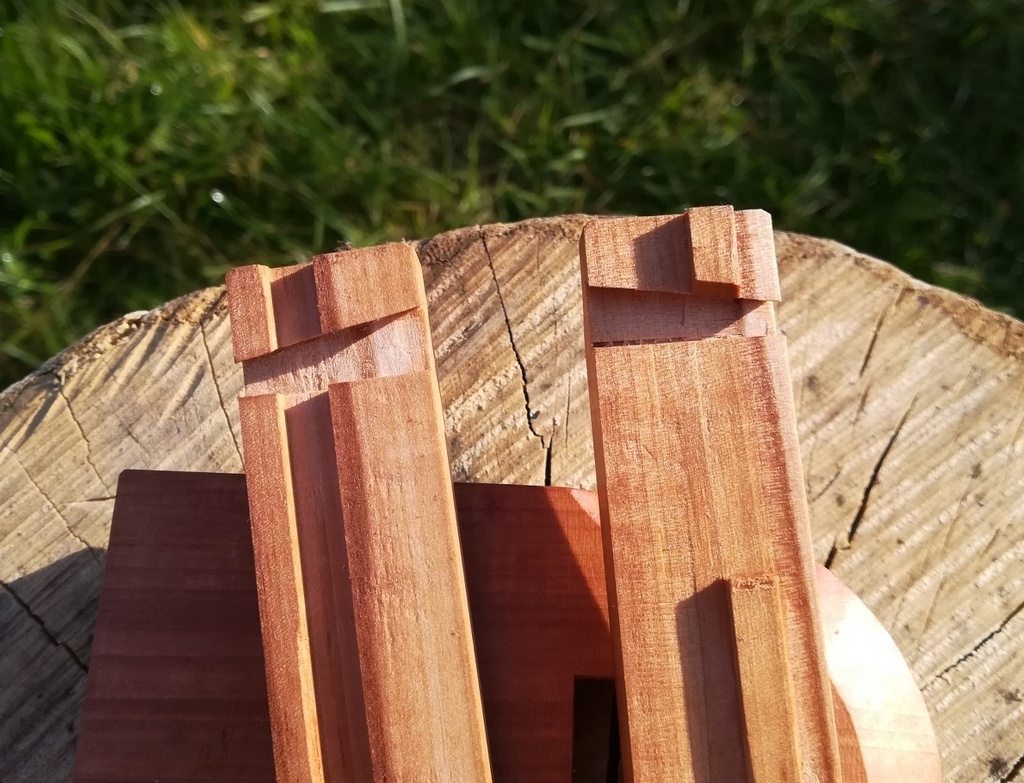 Le bois bicolore des tiges et des coins provient de la partie périphérique de la même bûche dont j’ai tiré la table du trusquin.