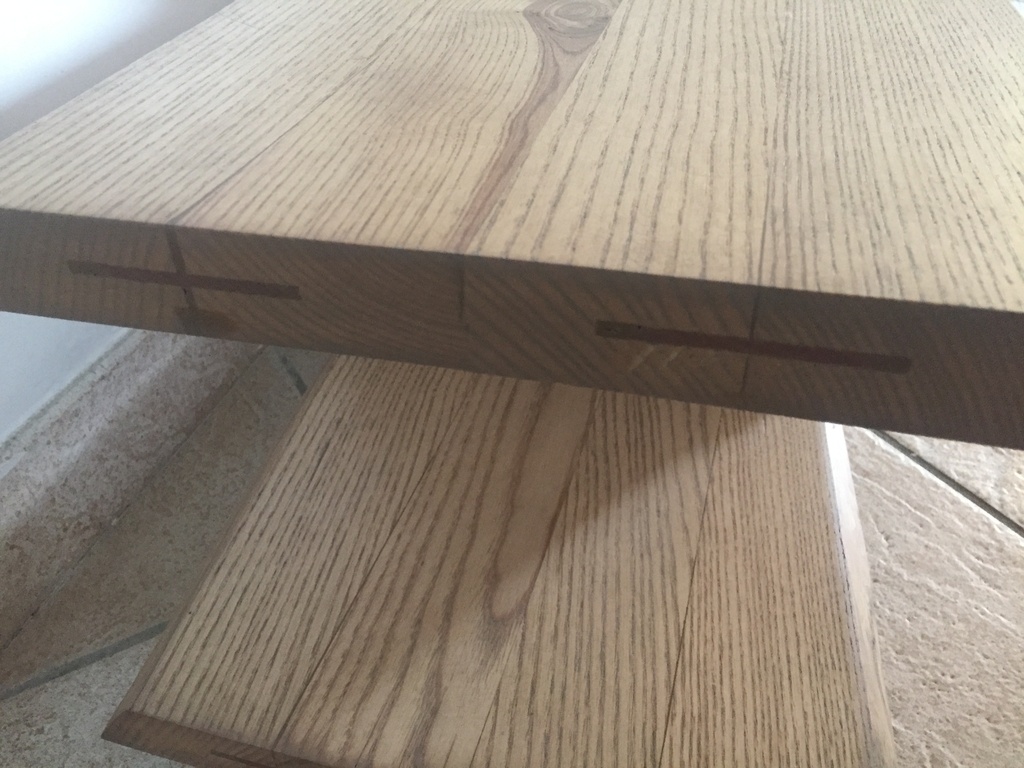 Les plateaux sont tous les deux en 4 planches collées à plat joint avec des lamelles. Ils sont renforcés en bout de plateau avec des demies lamelles collées.