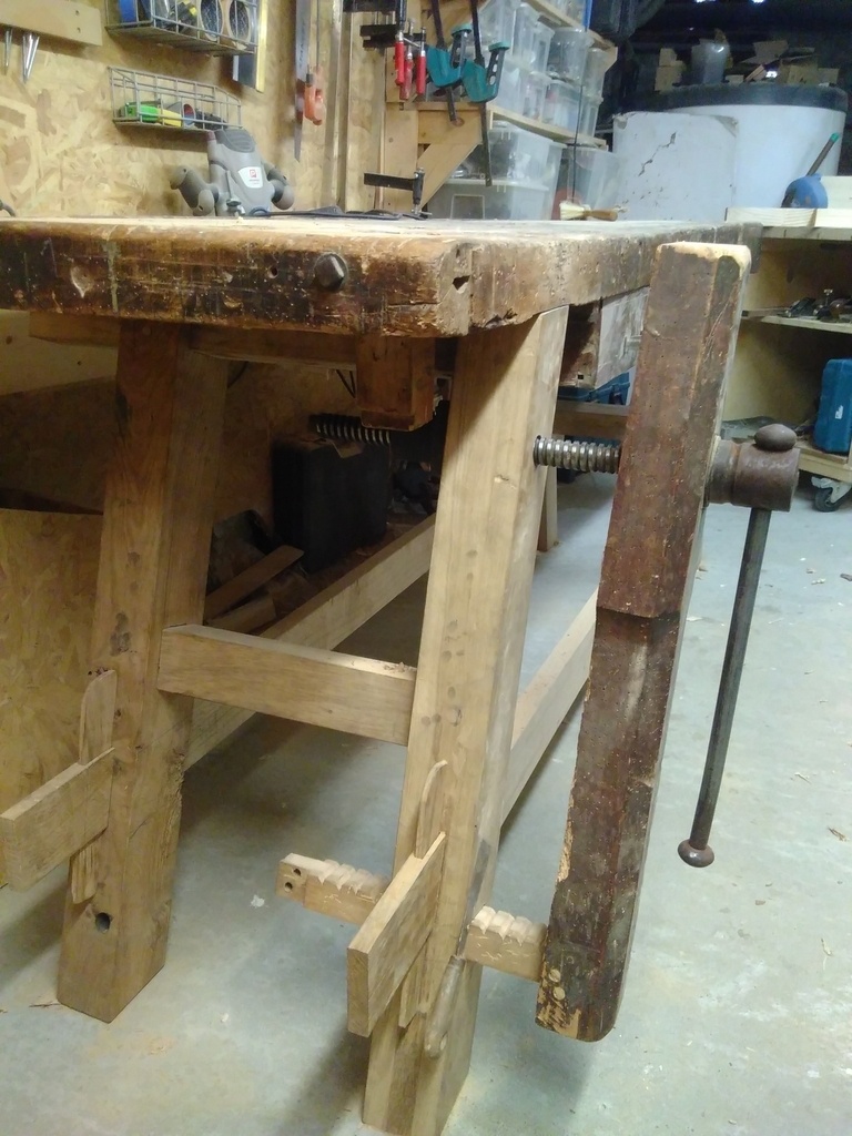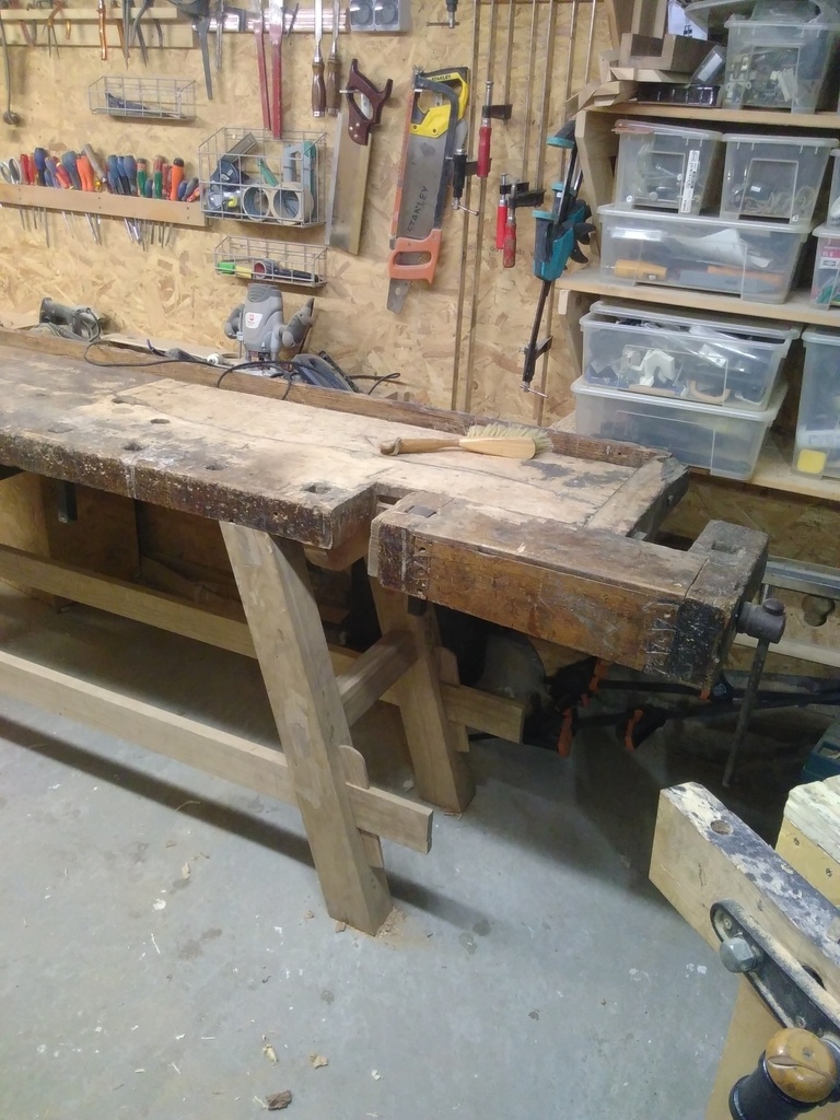 A la base j'étais partis sur la conception et la fabrication complète d'un établi de style Moravian. Puis je suis tombé sur une annonce d'un établi à restaurer. Avec ses presses et son plateau qui semble fonctionnelle j'ai choisi de partir sur cette base.