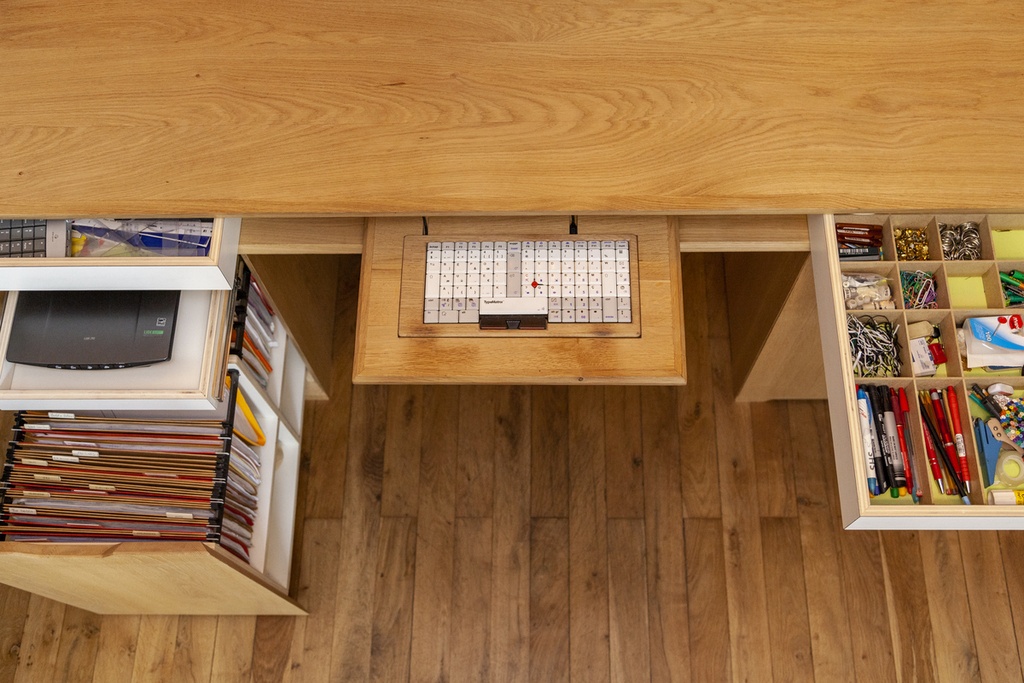 J'ai axé sur l'ergonomie et la disparition visuelle de tout câblage. Sur le premier bureau, tout le système électrique et les câbles informatiques se trouvent dans le plateau. C'est l'avantage de ce "plateau double" qui permet de cacher pas mal de choses en plus de pouvoir accueillir des tiroirs.