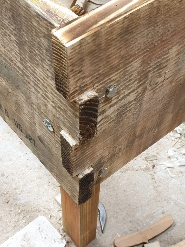 brûlé poncé peint à la peinture acrylique très diluer de facon aléatoire. Fixation Écrous boulons Rondelles inox, montage réalisé par un petit bricoleur de 3 ans, usage d'outil obligatoire, familiarisation du marteaux de la scie japonaise ( deux petite coupe ) agrafeuse