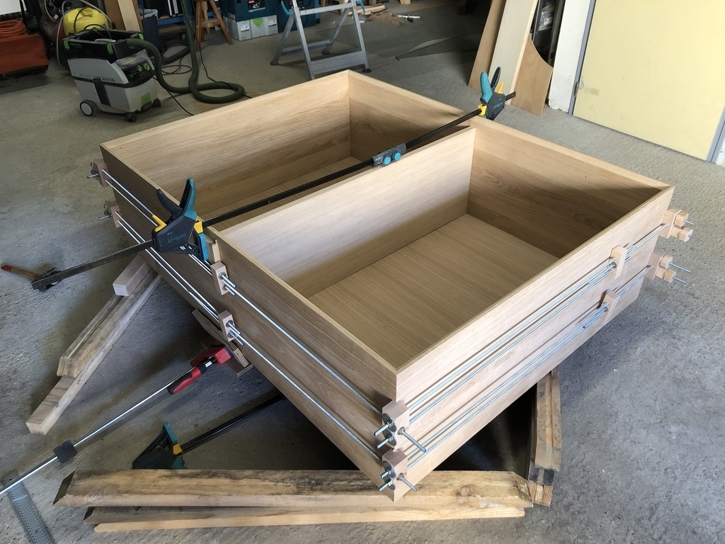 Le collage de la caisse avec le fond et la tablette du milieu fut épique ! J'ai fabriqué pour l'occasion le système de presse à cadre de Boris Beaulant, qui a bien fonctionné :