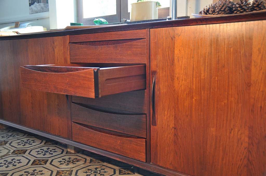 Voici quelques photos. Le meuble a été conçu par le designer Danois Arne VODDER (époque 1960). Réalisé en palissandre. Il fait 2,50 mètres. Grand soin des détails !!! Les volets sont parfaitement plans, éléments jointifs. Très inspirant ...