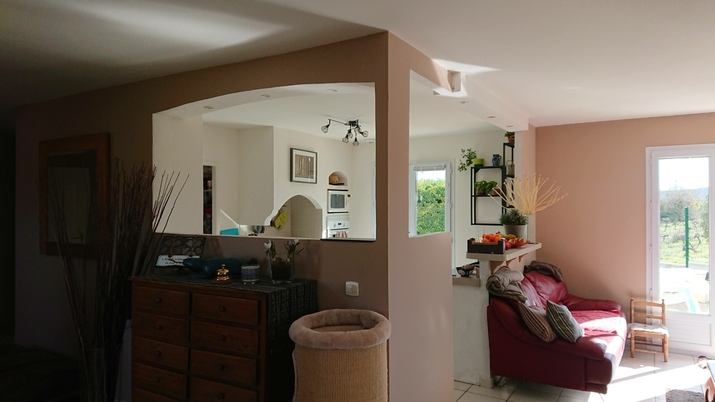 Ma cliente souhaitait créer une séparation plus importante entre sa cuisine et son entrée, tout en conservant une bonne visibilité et une certaine légèreté. Elle souhaitait également empêcher ses chats de monter dans la niche existante.