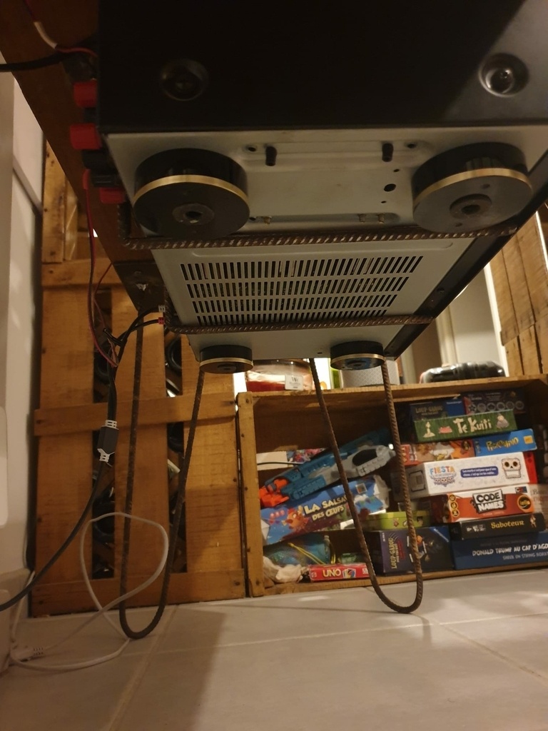 Petit plus, je voulais intégrer mon ampli sous la planche. J'ai donc fait des "L" en fer tord pour soutenir l'ampli. Ils sont en "L" et non pas en "U" pour ne pas les voir en façade. Ce n'est pas l'idéal, car l'ampli est lourd et les "L" sont un peu flexibles départ leurs conceptions. Je solidifierais peut être ça dans le futur.