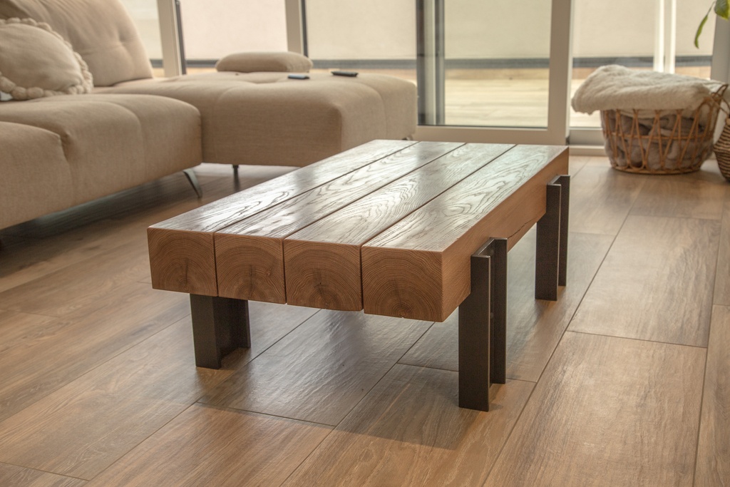Elle souhaitait une de ces tables basses avec le plateau réalisé avec des poutres.