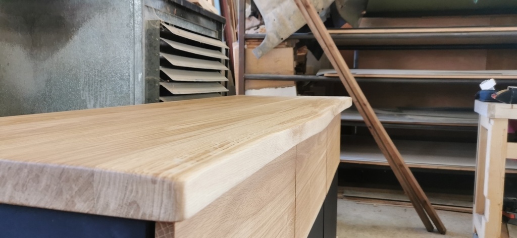 J'adore le design de cet ensemble. Le contraste entre le chêne et le noir fonctionne toujours aussi bien mais le fait d'avoir conservé un peu d'aubier qui marque la transition entre les 2 matériaux est tout simplement génial. C'est lumineux ! Et avec la continuité du fil sur l'ensemble c'est top. BRAVO !
