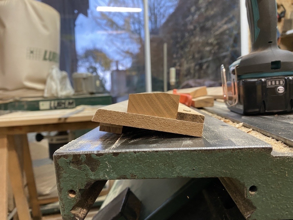 baguettes façonnées à la roboteuse, puis bouvetage à la défonceuse sous table. Assemblage à 45° avec renfort par domino, avec l'aide de la presse à cadre de Boris Beaulant