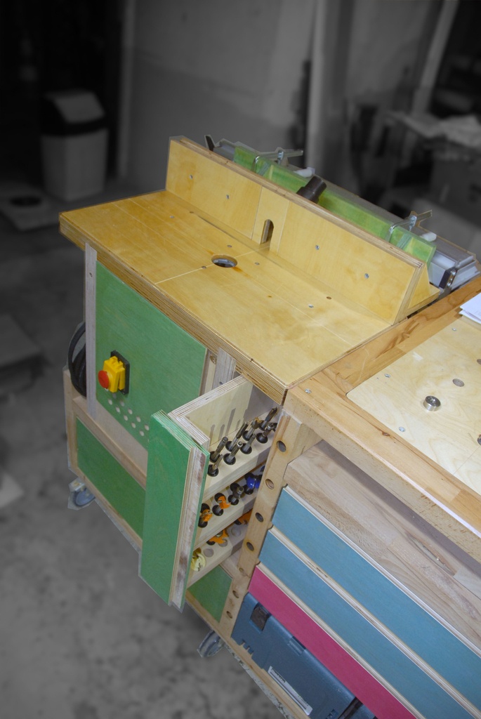 N'ayant que très peu de place, je souhaitais un établi multi-fonction qui puisse être mobile, intègre la scie et la défonceuse sous table et qui permette également de stocker un maximum d'outils et de consommables.