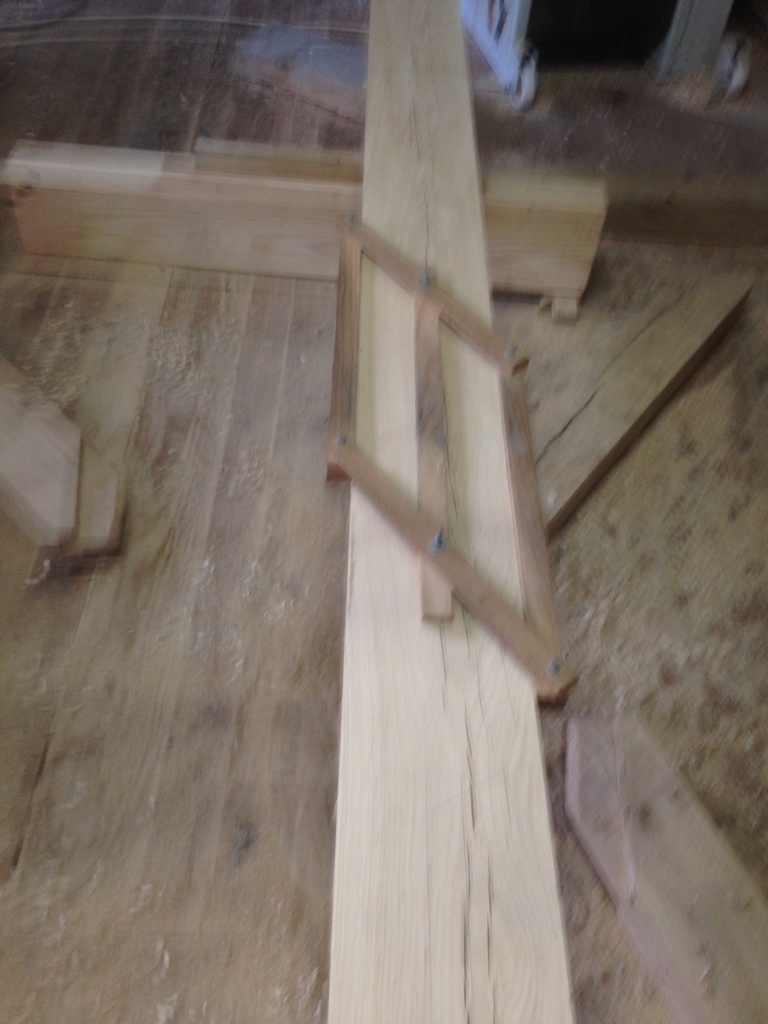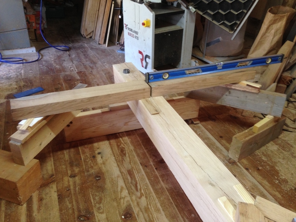 Maintenant je vais tailler la partie faîtage / traverses, je tourne les poteaux d'un quart, les positionne sur l'épure, toujours de niveau. J'ai fait le mi-bois de la croix avant de piquer les tenons ( la croix a deux fonctions, la première de bien contreventer, la seconde de donner un appui central au tableau ).