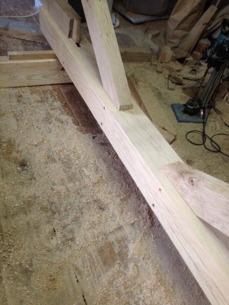 Je termine en rentrant le faîtage dans l'enfourchement, et je perce sur place. Ca me semble un peu risqué de mettre de la tire sur des tenons doubles, et pour la croix sur les traverses avec feuillures, lorsque je taillais je ne savais toujours si je percerai ou mettrai une vis...