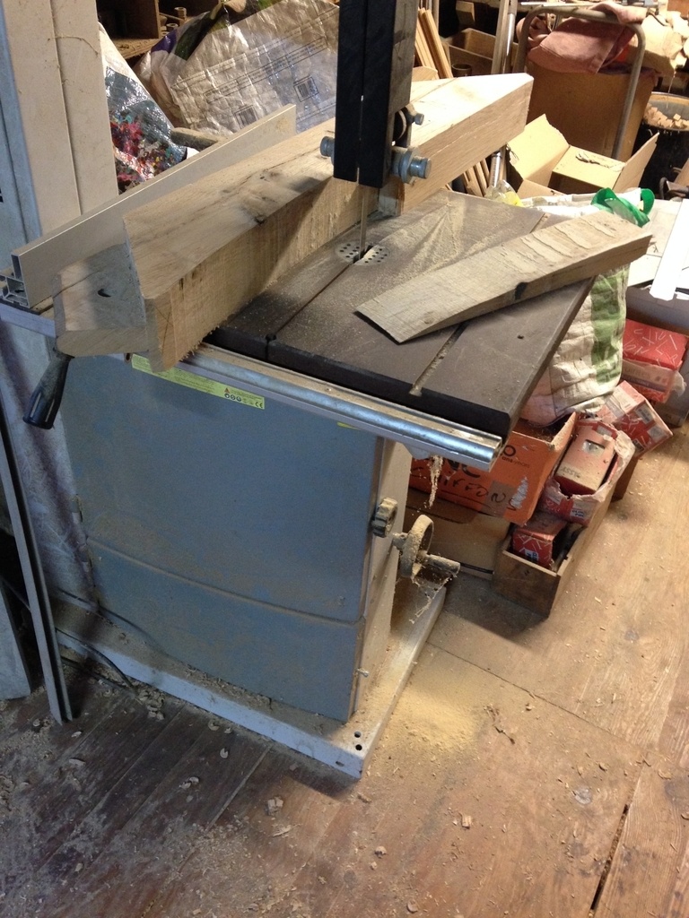 Je commence par les liens ronds, je fais une encoche au centre à la mortaiseuse, pour scier les liens à la ruban en deux fois ( la lame est au bout du rouleau et l'opérateur n'est pas un adepte de cette machine ).