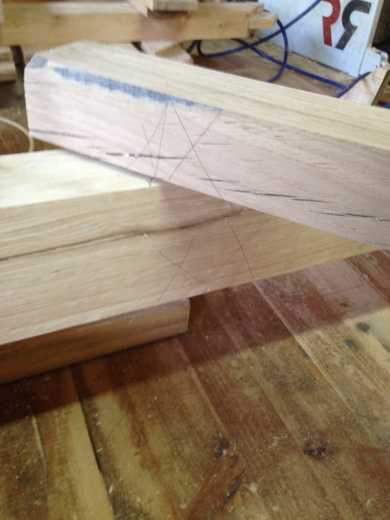 Je fais de même sur chaque élément, en évitant absolument de bouger la moindre pièce ( ici c'est du chêne mais avec des petites sections en sapin il faut être très vigilant ), je n'oublie pas de tracer le us faîtage pour remettre sur ligne plus tard.