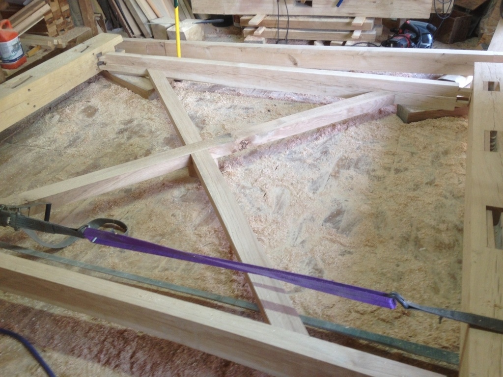 L'assemblage à blanc me permet de vérifier que tout colle, j'ai frotté une bougie sur tous les tenons pour les rentrer plus facilement. Je m'aide aussi de serre-joints car c'est nécessaire.