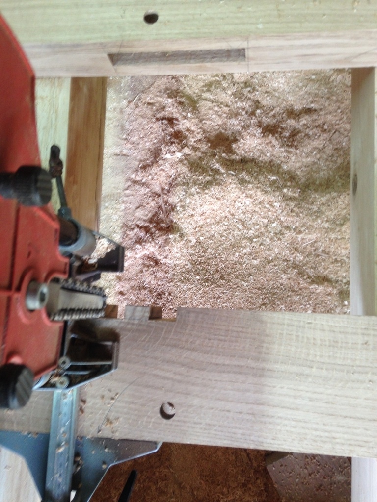 J'ai fait des tenons doubles pour les traverses, ici je mets un coup de craie bleue sur les chutes ( c'est le genre de truc ou je me plante facilement ), j'évide le centre à la mortaiseuse.