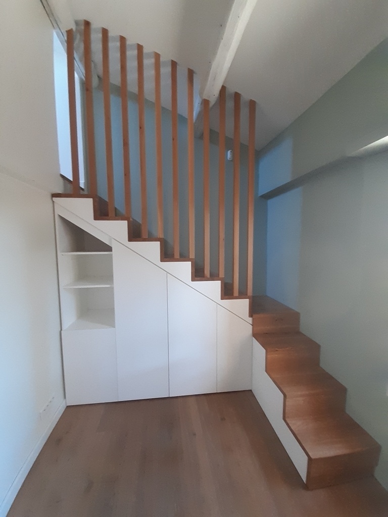 après la création d'une ouverture dans la partie haute du mur il fallait un meuble escalier pour y accéder et créer un espace de travail avec le bureau