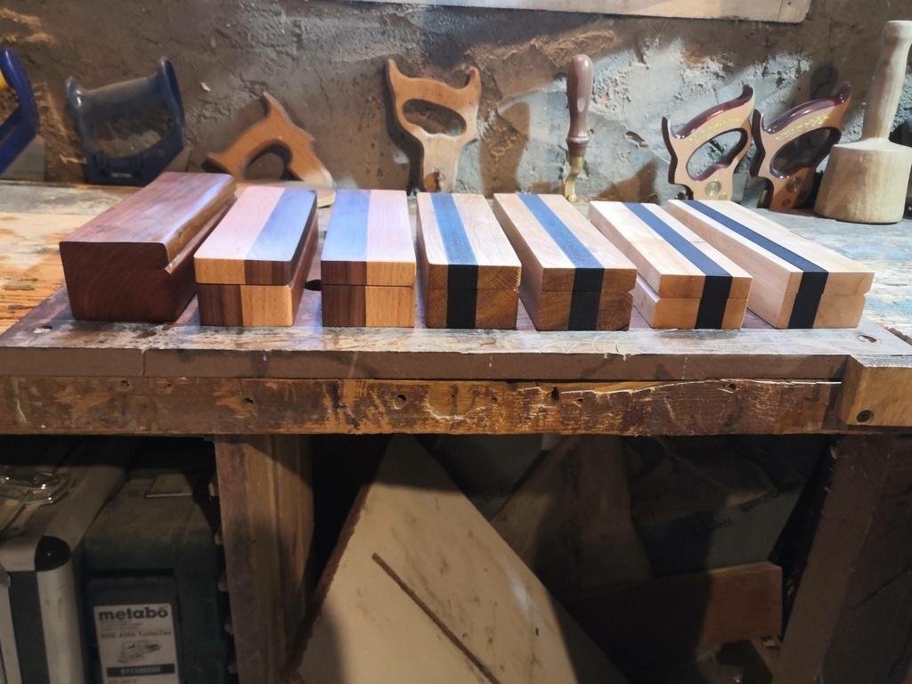 Petit ensemble de boites type plumiers (environ 6,5cmx21cm pour une hauteur de 5cm) creusées dans la masse.