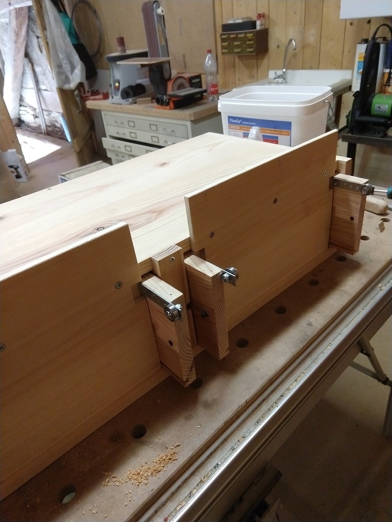 J'ai fabriqué aussi 2 tiroirs caissons en sapin et façade en chêne, écartés du plateau pour ne pas gêner l'utilisation de valets d'établi ainsi qu'une servante coulissante pour soutenir les planches longues.