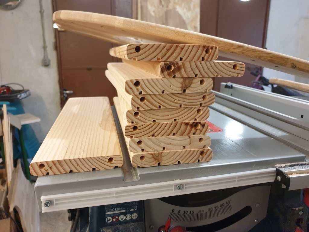 Les trous sont repérés à l'aide d'un gabarit : une plaquette rectangulaire aux dimensions de la tranche des lattes, avec les 3 trous pour marquer la position sur les flancs et les lattes au pointeau automatique. Un guide en bois dur a permis le perçage bien droit pour les lattes. A la perceuse à colonne pour le perçage bien d'équerre des flans. Les lattes sont arrondies à la défonceuse sous table (que je présenterai plus tard). Sur une face les trous vont par deux, pour les tourillons. Sur l'autre face c'est pour encastrer la tête des vis qui permettra de tout bien plaquer. Les lattes sont en sapin (lattes de parquet) épaisseur 18mm. Je ne sais pas pourquoi ils ont rajouté des traits de scie sur l'envers...