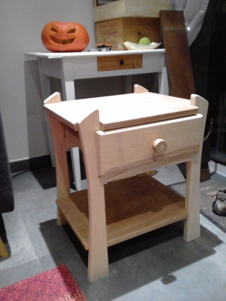 Premier projet réalisé depuis des plateaux de frêne et de l'avivé de sapeli. Il s'agit d'une reproduction des chevets réalisés par "Fabien"(que je remercie au passage), auquel j'ai ajouté une tablette inférieure, qui permet de mettre un peu plus de bazar, qui rigidifie l'ensemble et équilibre la table lorsqu'on ouvre les tiroirs que j'ai fait...massifs.