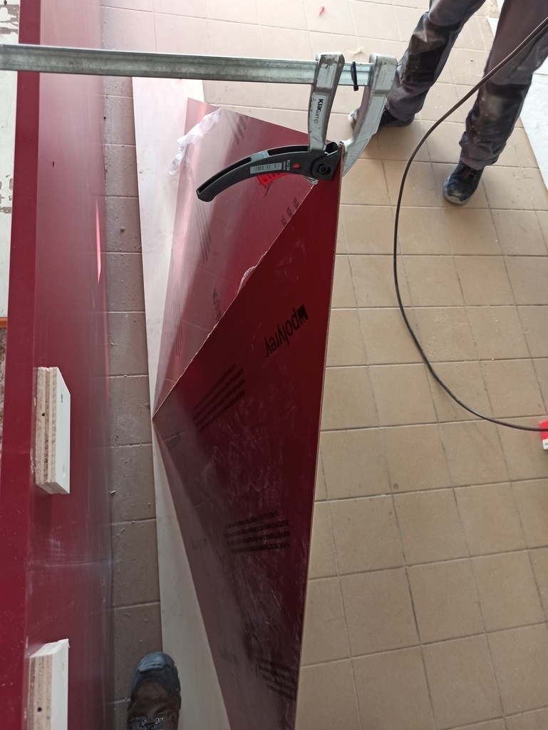 Predecoupage du stratifié et collage puis affleurage a la scie plongeante pour avoir des lignes parfaitement droite
