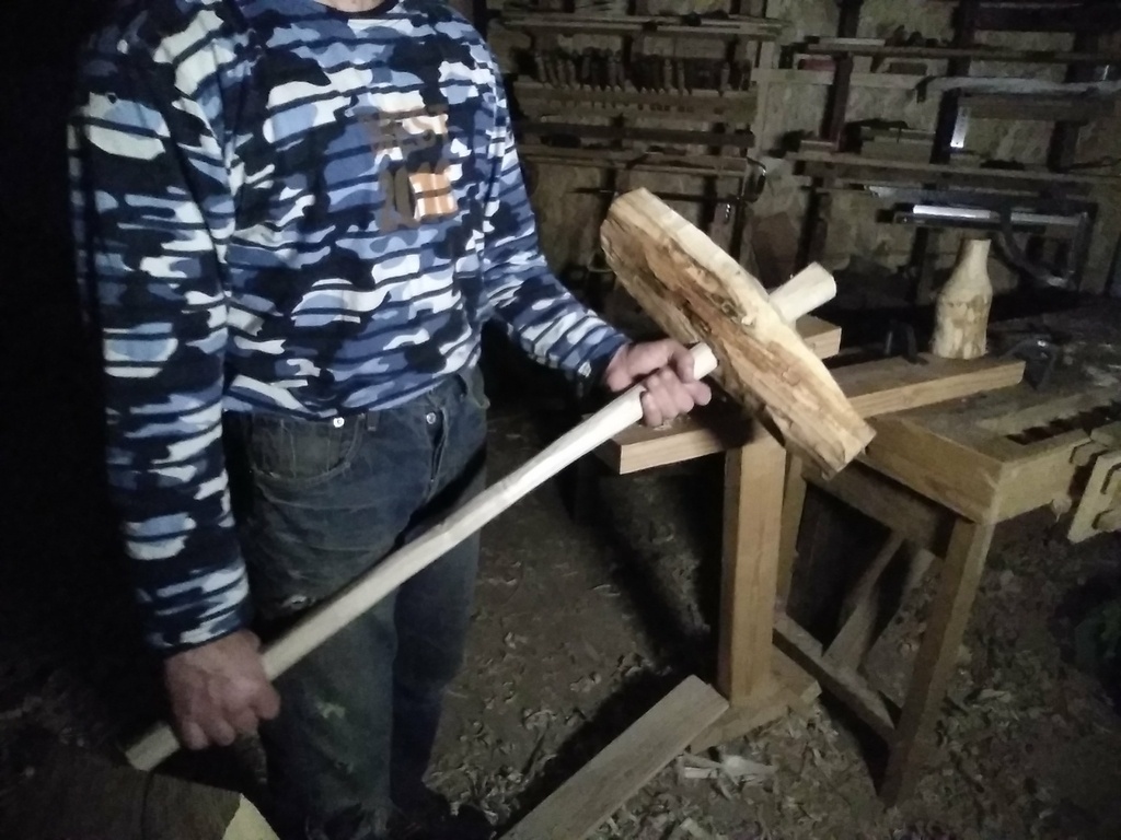 J'ai été chercher un tronc de fruitier (pommier certainement) sec dans le sous bois pour la tête et un quart de rondin de châtaignier sec pour le manche.