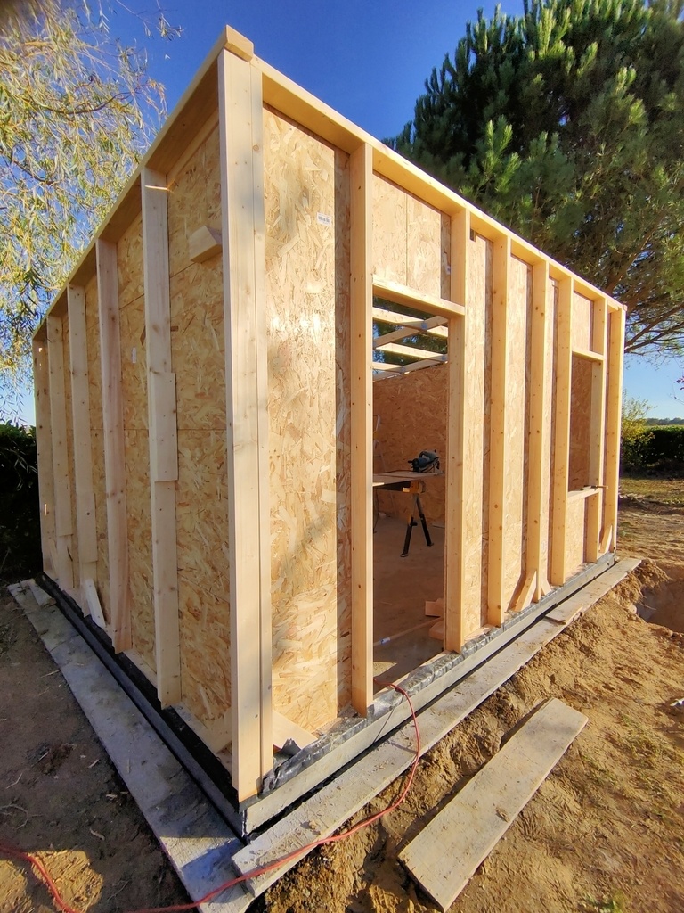 16 M2 en tout , ossature bois , bardage en clin , doublage en OSB , pare-pluie et bac acier.