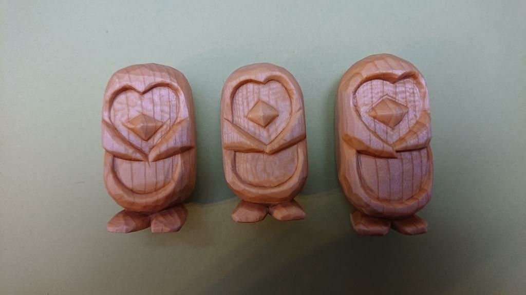 Des petits manchots en tilleul. Le modèle a été trouvé sur le net avec les mots clés : penguin wood carving. Ça rappelle furieusement le Tux de Linux