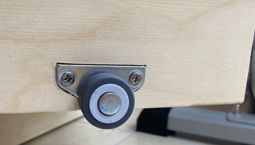 J'ai opté pour des roulettes latérales qui portent des tiroirs à 6 mm du sol. Le support métallique des roulettes est encastré de 2 mm (l'épaisseur du métal) dans les panneaux latéraux. L'usinage a été réalisé à l'affleureuse avec une fraise à copier et un gabarit maison, puis équarri au ciseau.