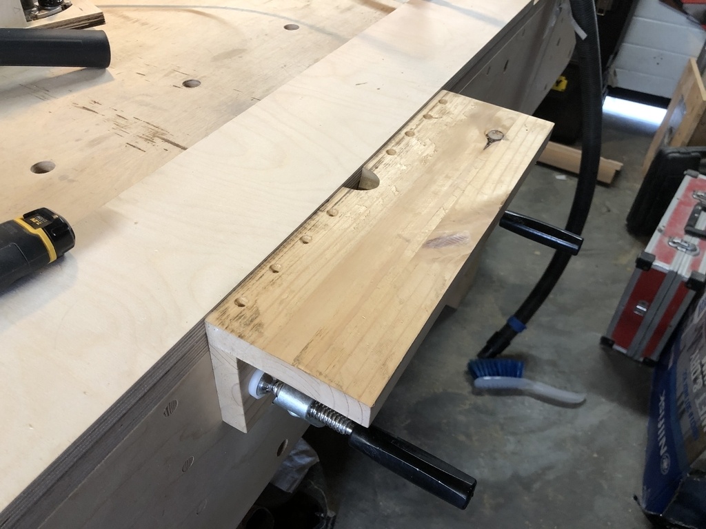 J'ai donc remplacé la vis par une tige filetée plus longue, pour pouvoir ancrer le pivot dans l'un des dog-holes de mon plan de travail.
