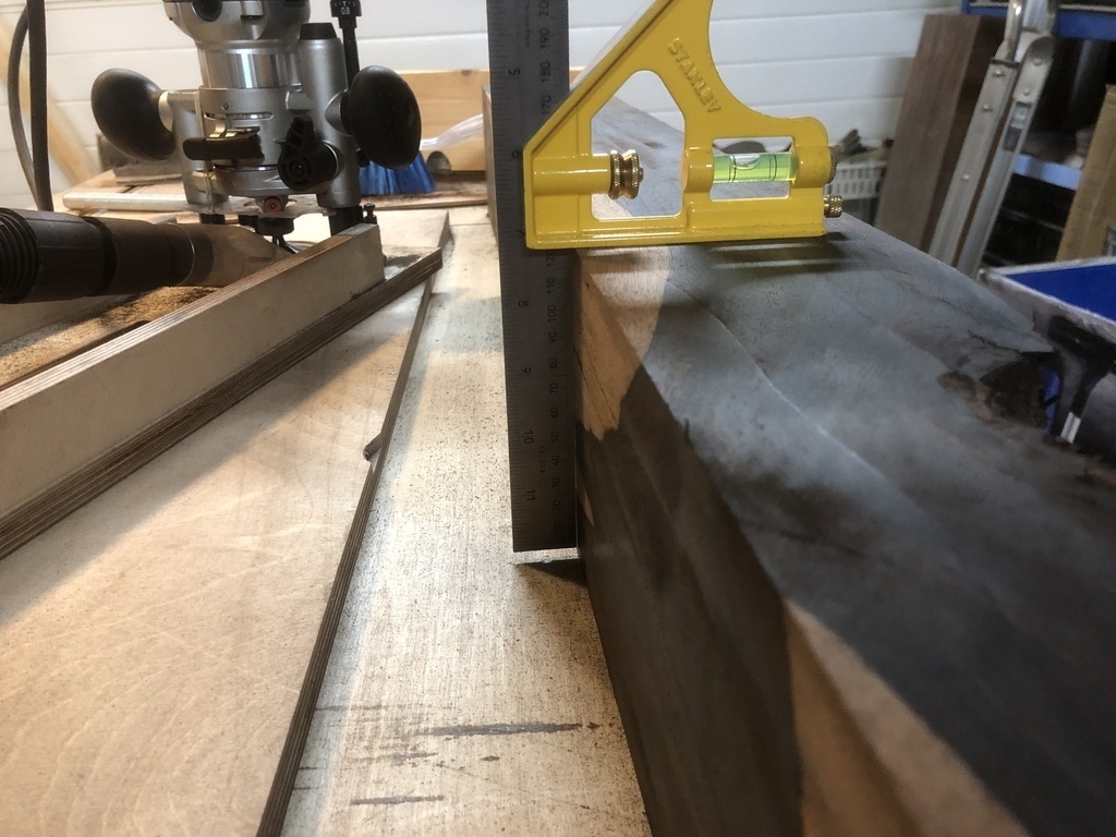 Si la pièce est lourde, pour faciliter la manutention, je positionne le guide de défonceuse surfacé dans le deuxième test comme une étagère sur le flanc de l'établi, à la bonne hauteur (de façon à ce que la pièce dépasse un peu de l'établi).