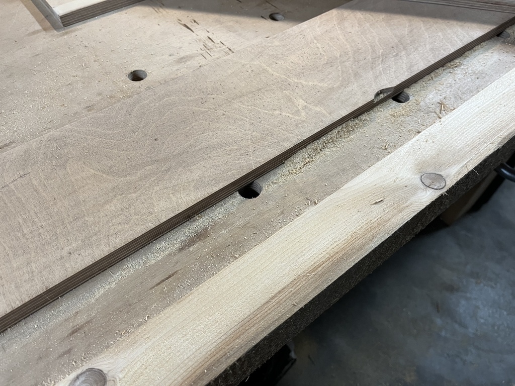 D'autre part, j'ai remarqué que le contreplaqué (pourtant de 16 mm et de bonne qualité) ne maintenait pas l'axe parfaitement plaqué sur l'établi, il avait une tendance à se courber et donc le montage se soulevait d'un ou deux millimètres.