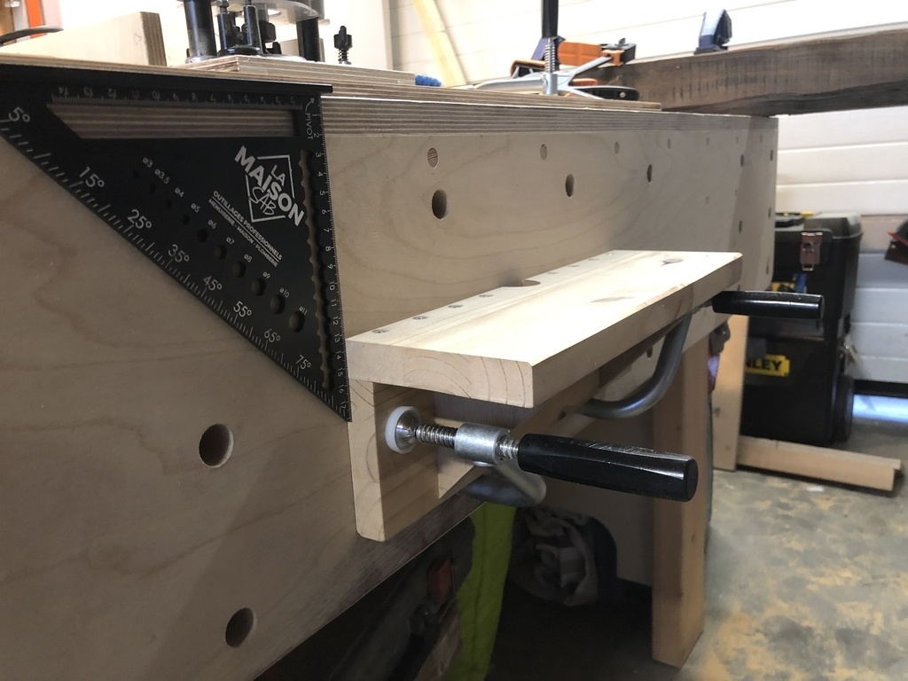 Je la bloquait initialement avec un valet, mais c'est en fait inutile : comme il y a le scotch de glissement entre la règle et le support de la défonceuse, la règle est mieux accrochée au plan de travail qu'au support et n'est pas entraînée par la défonceuse.