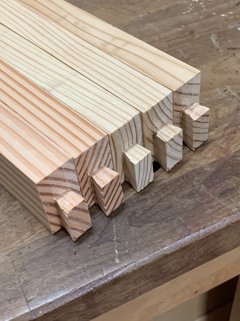Après le débit et le corroyage des pièces, les pieds sont assemblés par un collage à coupe d'onglet sur la hauteur (je n'avais pas les épaisseurs suffisantes pour un pied carré).