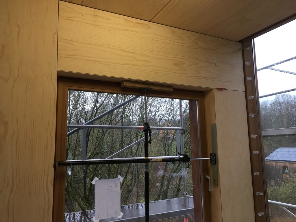 Le plafond réalisé à l'aide de panneaux multiplex en sapin de 12 mm. Il fallait un calepinage impeccable de 3 mm partout, y compris pour les angles des panneaux assemblés.