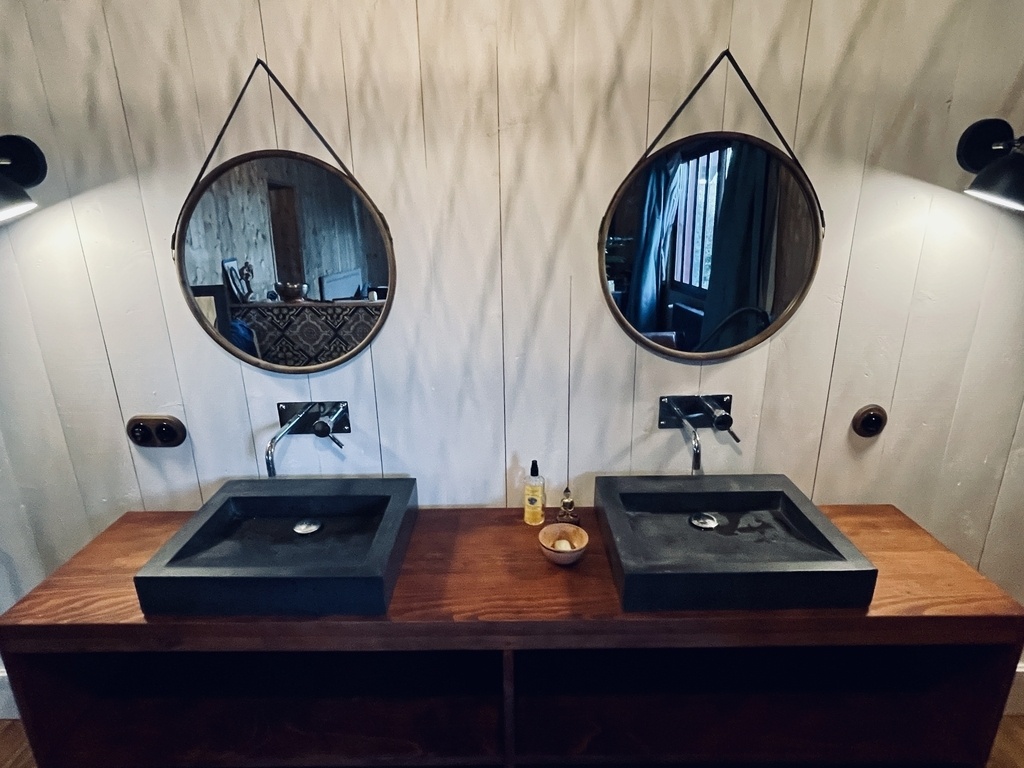 Projet de création d'un meuble en cèdre avec deux vasques pour notre salle de bains.