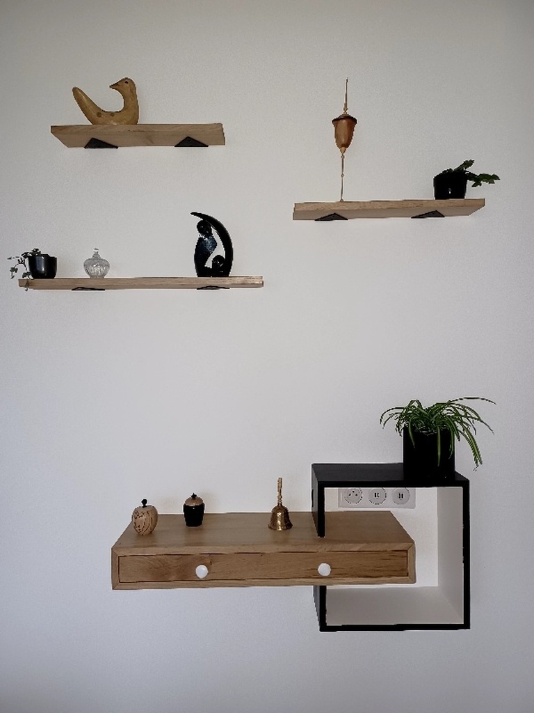 Juste une petite console en chêne et en pin peint en noir et blanc pour cacher les prises, pas droites, mais surtout pour mettre tout nos accessoires connectés à charger. La difficulté principale a été l'assemblage des 2 blocs