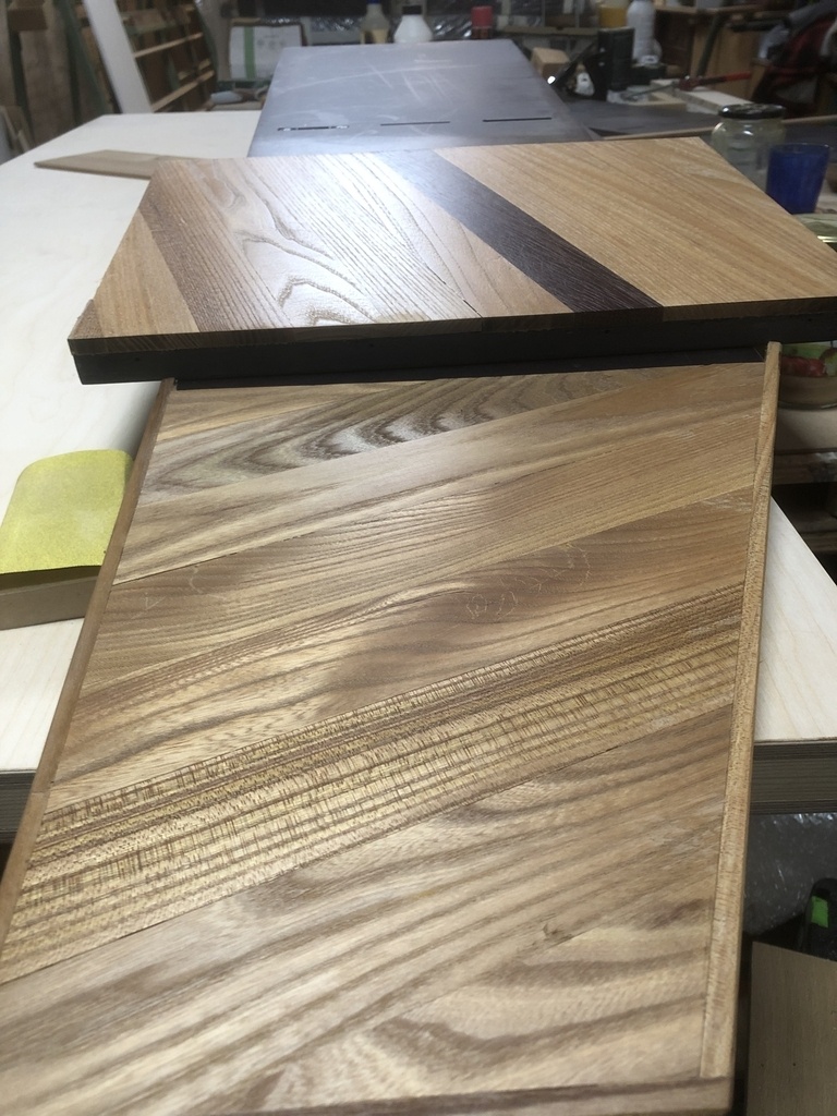 Voulant terminer le meuble de façon douce vers la fenetre, le meuble se termine en biais et cette fois, je m'adonne à un placage de l'orme provenant de la refente des 35mm et aussi d'un bois inconnu mais que je voulais mettre là, tout de biais, un petit déséquilibre pour contrebalancer l'aspect très "droit" du reste.
