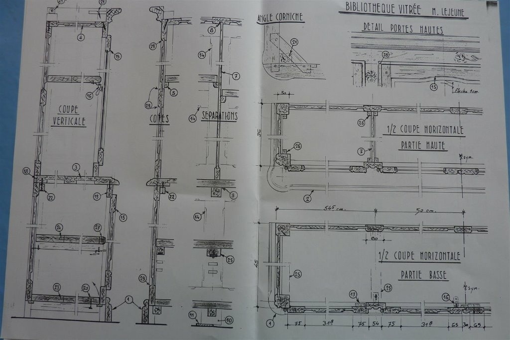 en cours de realisation j'ai rajouté 2 séparations verticales en parti haute car avec des rayons qui ne sont pas à la même hauteur les livres auraient basculés sur le rayon d'a coté .. les 2 plans en A3 ont eté fait apres la realisation pour un concours de "syseme D "en 1996 env.