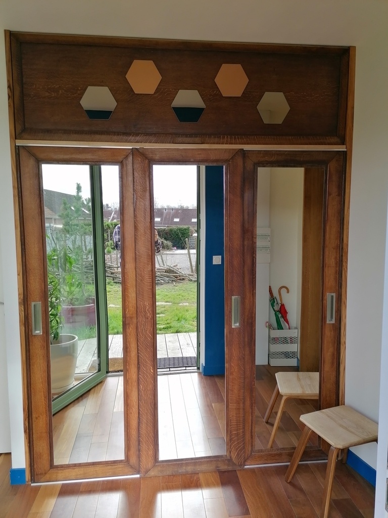 Placard d'entrée réalisé à partir de portes de récupération en chêne, le reste est en frêne. Les portes du bas coulissent, celle du haut se relève. Les portes avaient été lasurées, j'ai dû gratter, gratter et poncer. Finition huile de tung. Le petit tabouret a été réalisé avec un piètement de récupération et les chutes de frêne.
