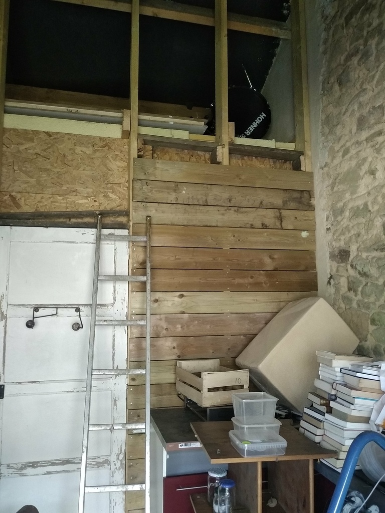 Dans l'atelier de mon pote au dessus du plafond, dans la grosse caisse de la batterie de son fils dans laquelle il y avait des coussins !