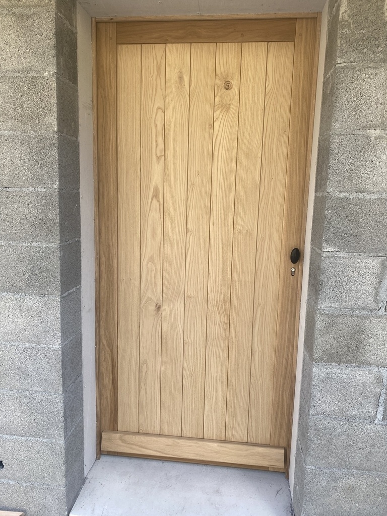 L’ouvrant un Joint aussi , les assemblages sont tenon mortaise , avec une plaque de polyuréthane au milieu et deux parements ,en bois massif rainure languette, l’un en châtaignier l’autre en chêne brun