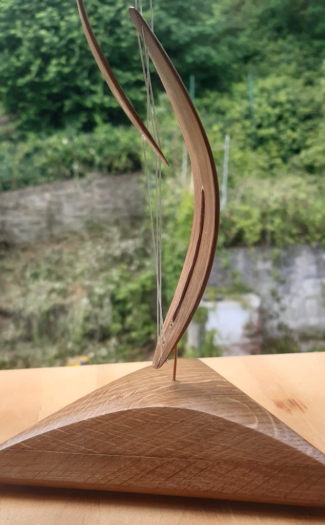 Au début je voulais faire comme ma première et utiliser deux fils tendeurs, qui empèchent en même temps la rotation des lamelles.